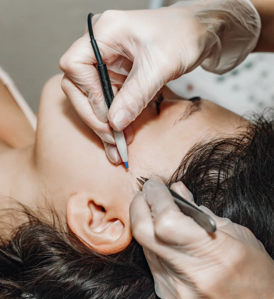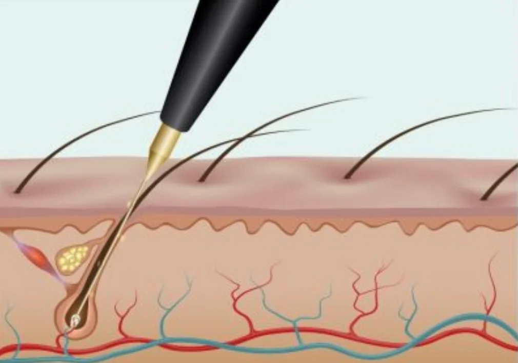 Lors d’une séance d’électrolyse des poils, on nettoie la zone puis on insère un filament stérile le long de l’orifice du poil pour délivrer un courant au niveau de la racine permettant une méthode d’épilation permanente. Le poil est ensuite retiré sans traction excessive.