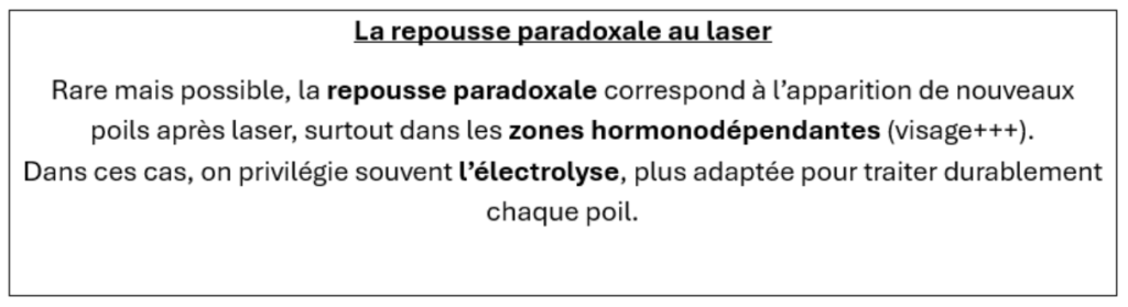 L’électrolyse évite le risque de repousse paradoxale dans les zones hormonodépendantes. Le risque d’une repousse paradoxale est plus élevé sur les zones hormono-dépendantes (menton, joues, cou), en cas d’un traitement laser avec des paramètres trop faibles, d’intervalles trop espacés, de phototypes plus élevés ou lorsqu’on arrache les poils entre les séances.