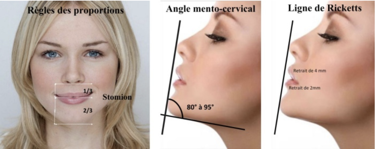 L’analyse du profil de chaque patient guide la stratégie de remodelage du menton et évite la sur-correction inutile. Pour cela on s’aide des lignes et angles des “standards de beauté” : la ligne de Ricketts et l’angle mento-cervical.